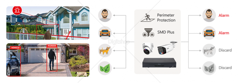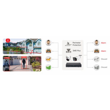 IVS (zaščita perimetra): Tripwire; vdor; plezanje čez ograjo; odkrivanje postopanja; zapuščen/pogrešan predmet; hitro premikanje; zaznavanje parkiranja; zbiranje ljudi; razvrstitev alarma vozila/človeka; sledenje povezav