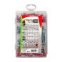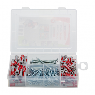 Praktična škatla vsebuje izbran asortiment vložkov, vijakov za najpogostejše vrste pritrjevanja.