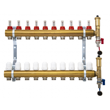 Razdelilec sestavlja: dovodni razdelilec z regulacijskimi ventili (z merilnikom pretoka), odvodni razdelilec z regulacijski ventili (ročni) z možnostjo zategovanja, T člen, polnilna pipa, nosilca