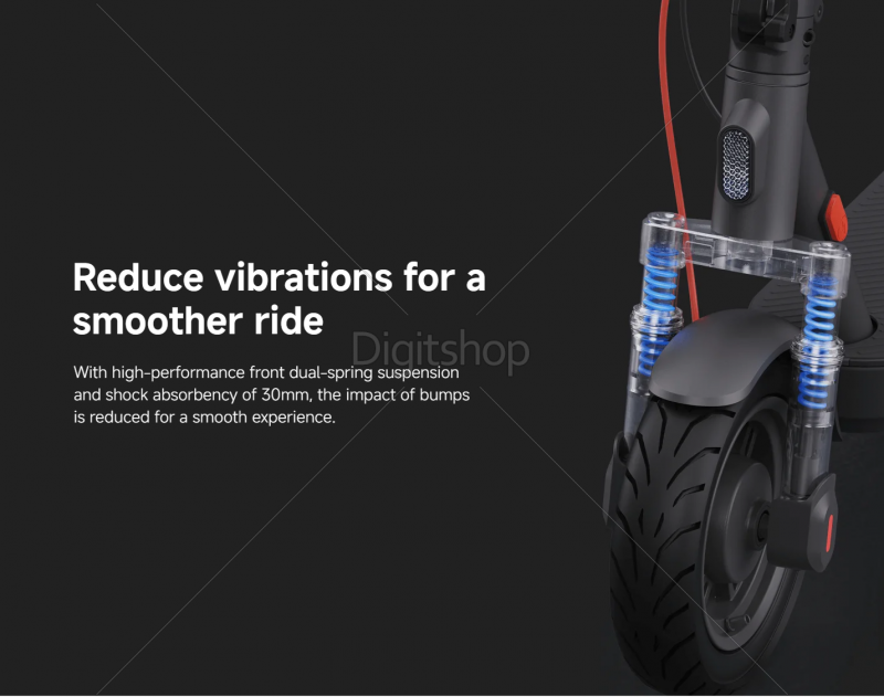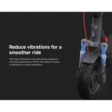 10-palčne pnevmatike brez zračnic z nizkim kotalnim uporom omogočajo boljšo stabilnost v ovinkih, večjo oddaljenost od tal in izboljšano življenjsko dobo baterije. Dvojni zavorni sistem z bobnastimi zavorami in zadnjim E-ABS omogoča učinkovito zaviranje in zmanjšano zavorno razdaljo, kar zagotavlja varno in stabilno vožnjo.