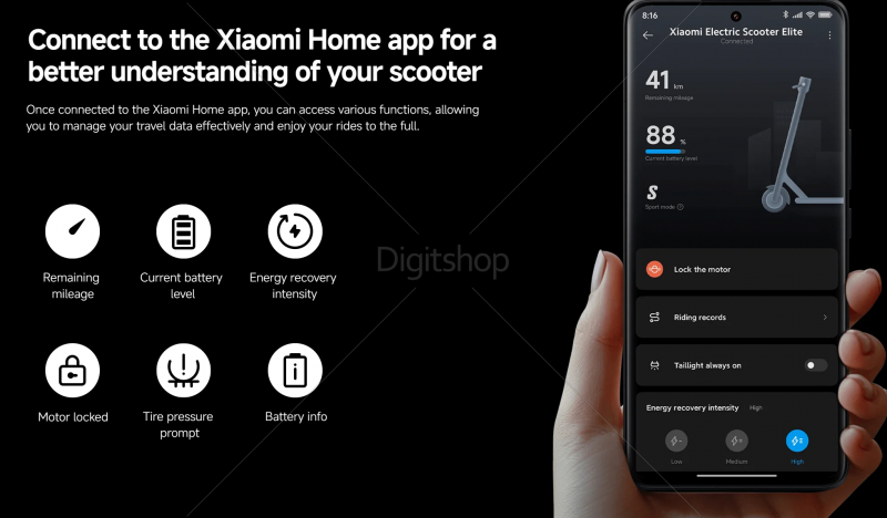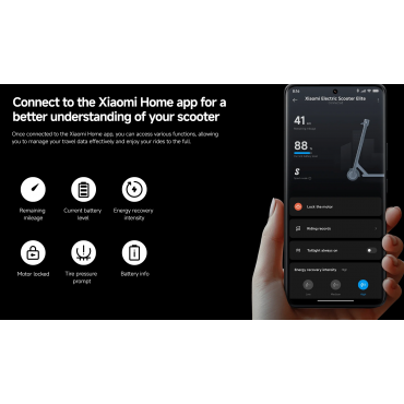 Z aplikacijo Xiaomi Home lahko spremljate preostali doseg, trenutno stanje baterije, intenzivnost rekuperacije energije in druge podatke. Dodatne funkcije, kot so opozorila za tlak v pnevmatikah ali zaklep motorja, vam omogočajo popoln nadzor nad skirojem. *Prva povezava z aplikacijo je potrebna za delovanje skiroja
